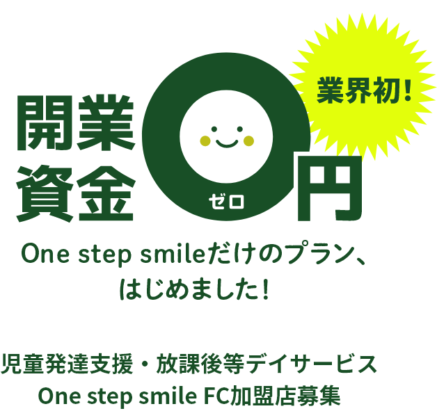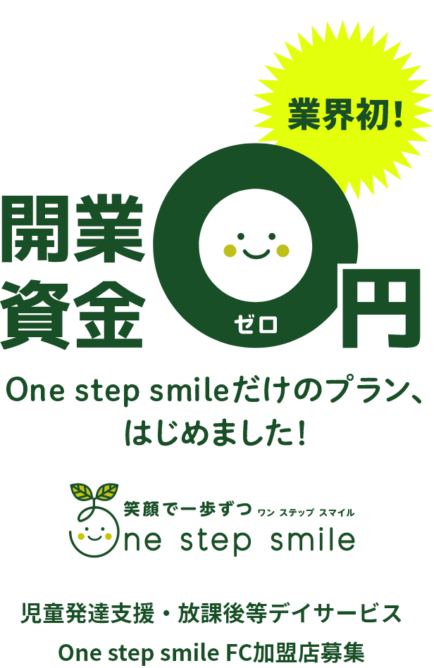 One step smile は、FC 加盟を新機軸にとご検討中の企業や個人事業主の方、また独立して教室運営をめざす児発管の方、脱サラなどで療育参入を検討されている未経験者の方もしっかりサポート!安心の体制を整えています。