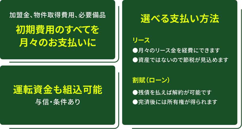 初期投資をなるべく抑える、加盟金を含めて当面かかる費用の融資を受けたいなど、事業計画に即した資金繰りにお応えします。