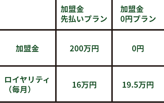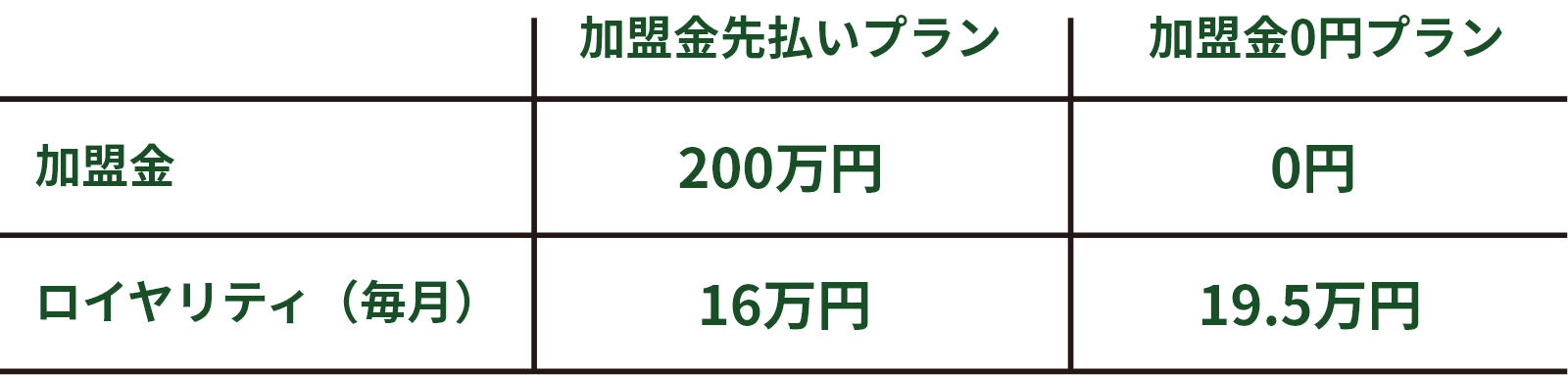 即開業の思いにお応えする初期費用を抑えて即開業したいという方々の希望にお応えする加盟金のないプランがあります。また、加盟金のある(200万円)プランでは、ロイヤリティの定額を一段と低く抑える事ができます。