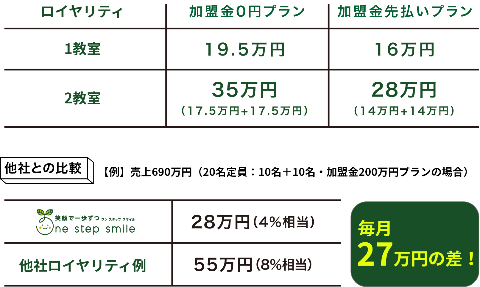 経営基盤が安定する毎月のロイヤリティを低く抑えることができることも、One step smileの魅力の1つ。さらにロイヤリティが固定のため、増えた売上げはそのまま収益に。 児童のスマイルが増え、成長を遂げるほどに、事業も成長・発展していきます。